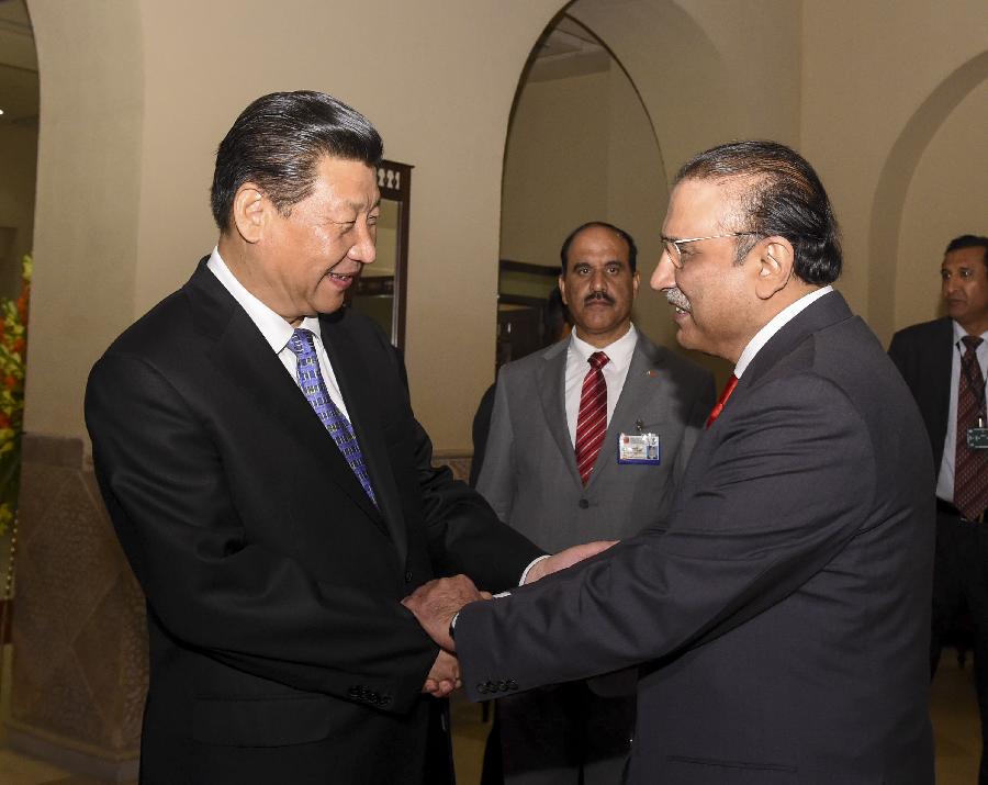 | Chinese President Xi Jinping (L) shakes hands with Asif Ali Zardari, former Pakistani president and co-chairperson of the Pakistan People's Party (PPP), as he met with leaders of the Pakistani major parties in Islamabad, capital of Pakistan, April 20, 2015. (Xinhua/Li Xueren) |