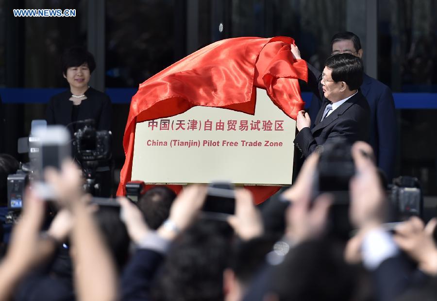 Huang Xingguo, mayor of north China's Tianjin Municipality, inaugurates the China (Tianjin) Pilot Free Trade Zone in Tianjin, China, April 21, 2015. Three new free trade zones (FTZ) began official operation on April 21, 2015 as China seeks to draw more international commerce. (Xinhua/Yue Yuewei)