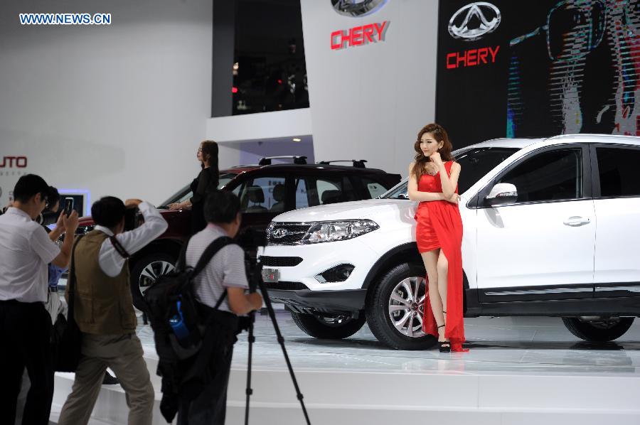 A model presents a Chery car during an auto exhibition in Hefei, east China's Anhui Province, Sept. 30, 2014. China's Chery Automobile Co., Ltd. has spent more than seven percent of their annual saleroom on the development of new products since 2002. There are more than 6,000 members in its research and development department. After a ten-year independent innovation, Chery Auto has owned more than 7,000 authorized patents. (Xinhua/Liu Junxi)