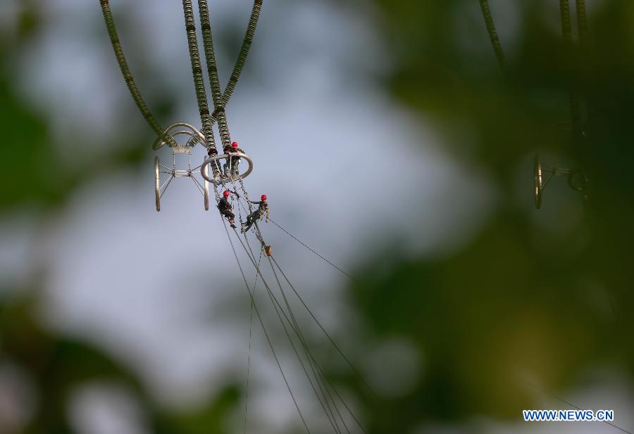 Workers work on 1,000-kilovolt power transmission project about a hundred meters above the ground in Wangdian Township of Huai'an City, east China's Jiangsu Province, May 30, 2015. (Xinhua/Zhou Haijun)