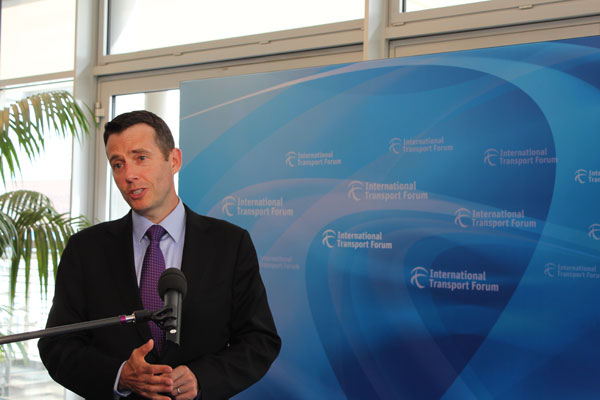 David Plouffe, senior vice president of policy and strategy of Uber, answers questions at the International Transport Forum in Germany on May 29, 2015. The ITF at the OECD is an intergovernmental organization that acts as a think tank and organizes an annual summit of ministers of transport. [Photo/China Daily]