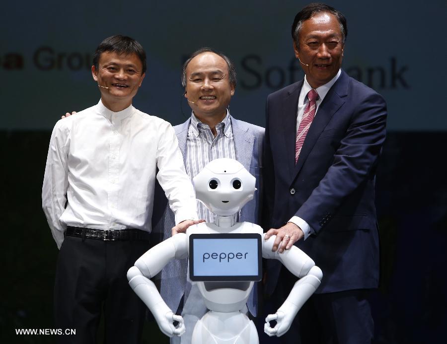 (From L) Jack Ma, or Ma Yun, Chairman of the Board of Alibaba Group, Softbank's president Masayoshi Son, and Terry Gou, founder and chairman of Foxconn, pose for photo with a humanoid robot "Pepper" during the Softbank's press conference in Chiba, near Tokyo, Japan, June 18, 2015. Softbank announced that it will start to sell the emotional robot to the public on June 20 with the price of 198,000 yen (about 1,610 U.S. dollars). (Xinhua/Stringer)