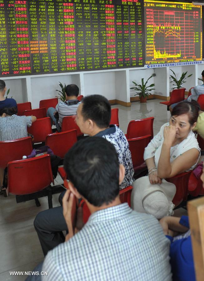 Investors look through stock information at a trading hall in a securities firm in Haikou, capital of south China's Hainan Province, June 19, 2015. Chinese stocks plunged on Friday, with the benchmark Shanghai Composite Index diving 6.42 percent, to finish at 4,478.36 points. The Shenzhen Component Index plunged 6.03 percent, to close at 15,725.47 points. (Xinhua/Zhao Yingquan)