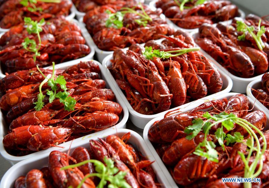 Photo taken on July 11, 2015 shows newly-cooked crayfishes of maker Zhou Jianquan's online store in Hongze County of Huai'an, east China's Jiangsu Province. The 39-year-old Zhou Jianquan opened his online crayfish store in 2015. His "wechat, ecommerce and express delivery" business mode is welcomed by a large amount of customers. (Xinhua/Zhou Hongming)