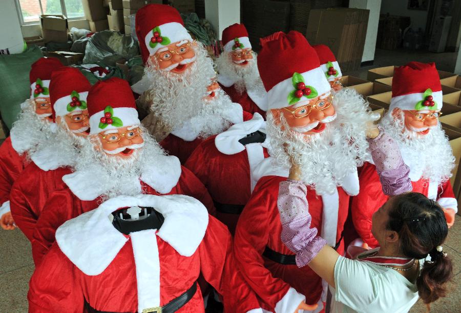 A factory manufactures Santa Claus toys on July 22 in Yiwu city, east China’s Zhejiang province. (Photo/ Xinhua)
