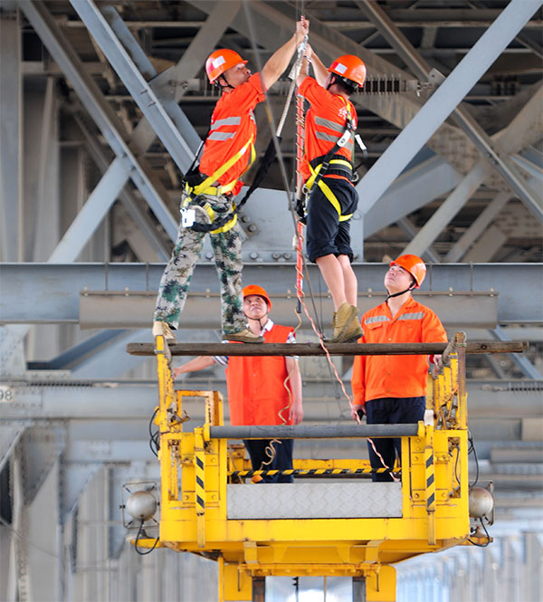 Workers reinforce a bridge on the Yangtze River in Jiujiang, Jiangxi province. The country's top economic planner said its priority for the second half of the year is to optimize the allocation of financial resources. [Photo/China Daily]