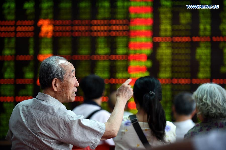 Investors look through stock information at a trading hall in a securities firm in Shenyang, northeast China's Liaoning Province, July 7, 2015. Chinese shares lost to negative territory on Tuesday, with the benchmark Shanghai Composite Index down 1.29 percent to finish at 3,727.13 points. The Shenzhen Component Index slumped 5.8 percent to close at 11,375.6 points. (Xinhua/Pan Yulong)