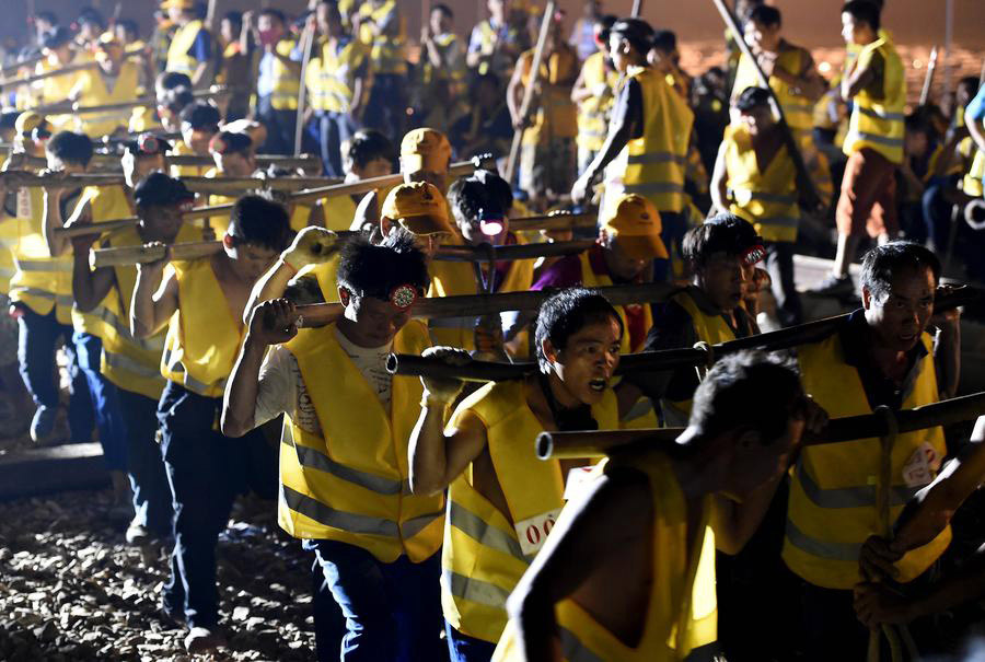 Railway staff members lay rail tracks at Caogusi circuit station of Zhengzhou Railway Signal Depot in Zhengzhou, capital of Central China's Henan province, on August 3, 2016. [Photo/Xinhua]
