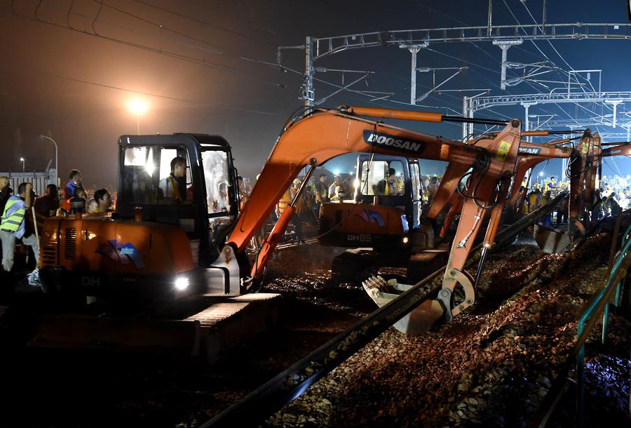 Constructors worked hard overnight from Tuesday to complete a key joining facility of the section to link the high-speed railways from Beijing to Guangzhou, Xuzhou to Xi'an, and Zhengzhou to Kaifeng.