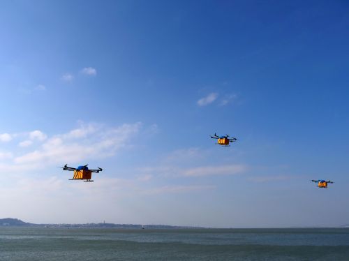 Flying into a strong wind, the drones took nine minutes to make the five-kilometer crossing. Each drone can carry up to seven kilograms.