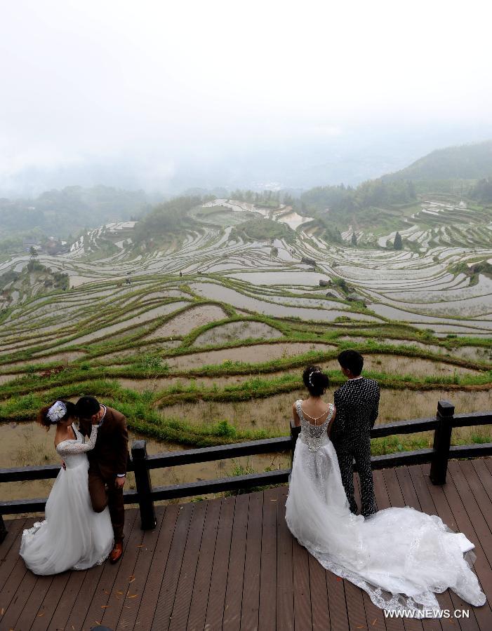 Young couples pose for wedding photos with the terraced fields as background in Chongtou Town of Yunhe County in Lishui City, east China's Zhejiang Province, May 17, 2014. (Xinhua/Liang Zhen)