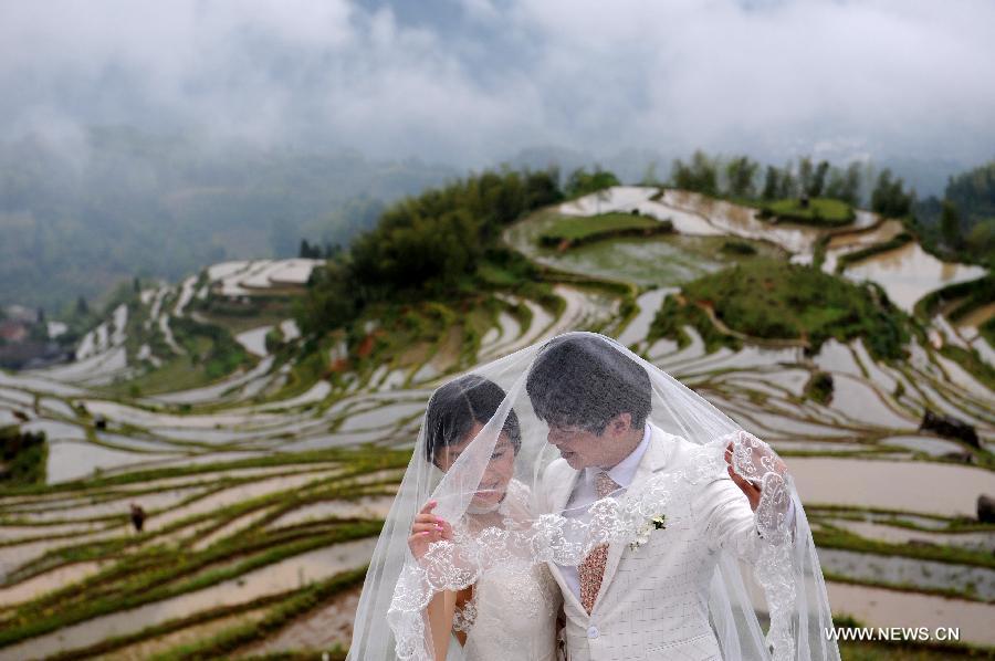 A young couple pose for wedding photos with the terraced fields as background in Chongtou Town of Yunhe County in Lishui City, east China's Zhejiang Province, May 17, 2014. (Xinhua/Liang Zhen)