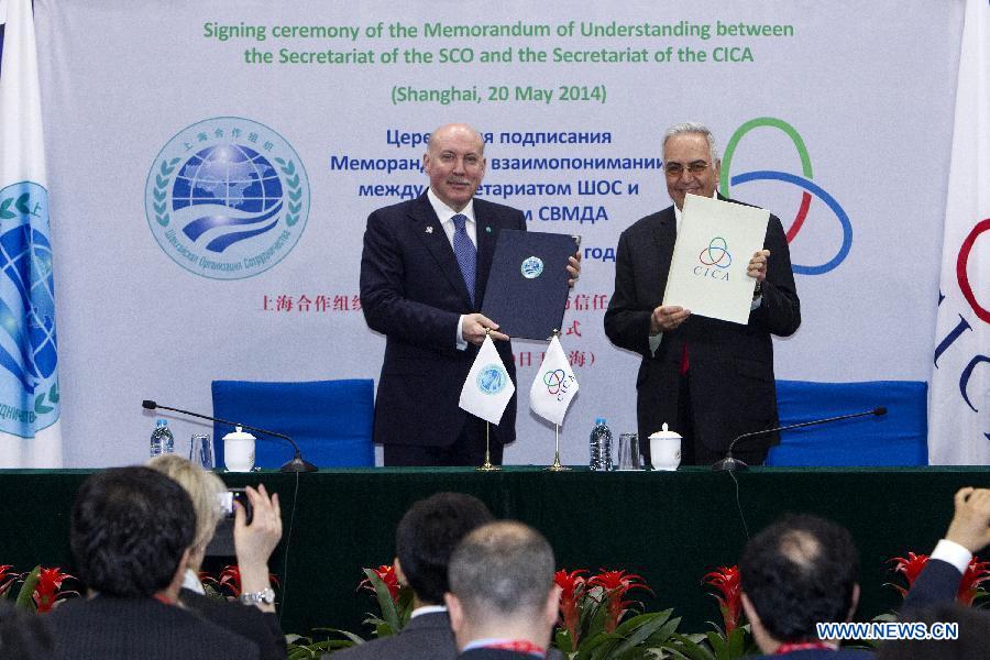 | Shanghai Cooperation Organization (SCO) Secretary-General Dmitry Fedorovich Mezentsev (L) and Ambassador Cinar Aldemir, executive director of Secretariat of the Conference on Interaction and Confidence Building Measures in Asia (CICA), pose for photos after signing a memorandum of understanding during a signing ceremony in Shanghai, east China, May 20, 2014. (Xinhua/Lyu Xun) |