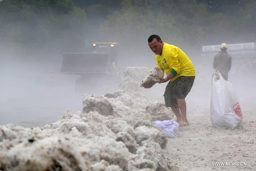 A man collects hail in a street in Sao Paulo, Brazil, on May 19, 2014. A severe hailstorm struck the city of Sao Paulo on Sunday. (Xinhua/Rahel Patrasso)
