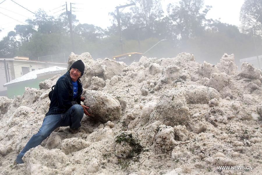 | A man poses for photos with hail in a street in Sao Paulo, Brazil, on May 19, 2014. A severe hailstorm struck the city of Sao Paulo on Sunday. (Xinhua/Rahel Patrasso) |
