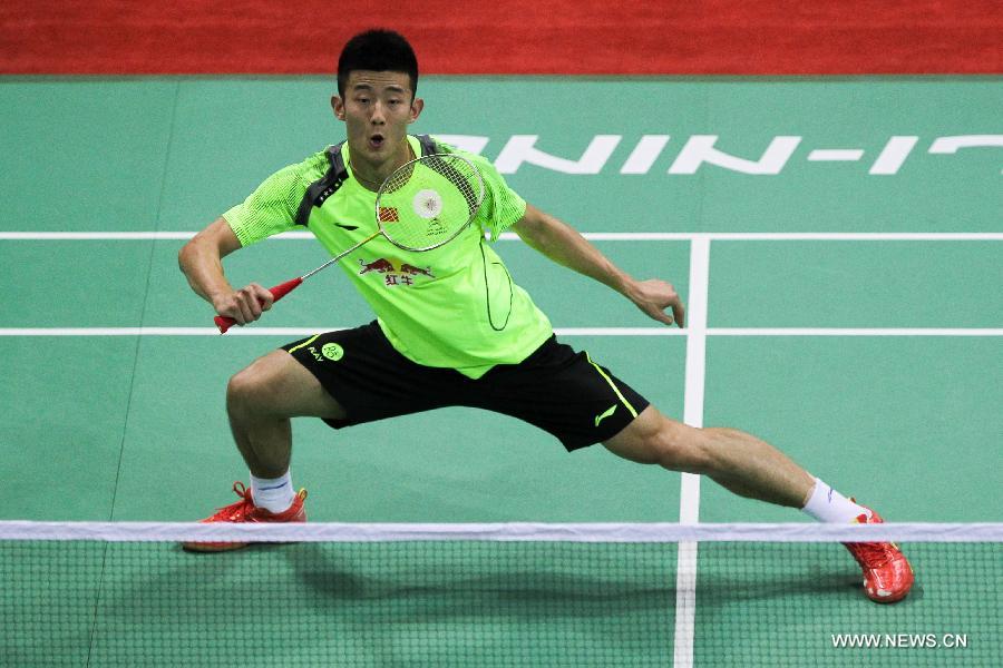 Chen Long of China returns a shot during the Thomas Cup Group D match against Russia's Vladimir Malkov, at the Siri Fort Stadium in New Delhi, India, May 19, 2014. Chen Long won 2-0. (Xinhua/Zheng Huansong)