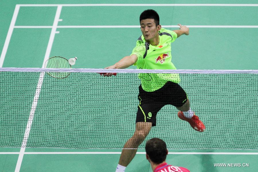 | Chen Long of China returns a shot during the Thomas Cup Group D match against Russia's Vladimir Malkov, at the Siri Fort Stadium in New Delhi, India, May 19, 2014. Chen Long won 2-0. (Xinhua/Zheng Huansong) |