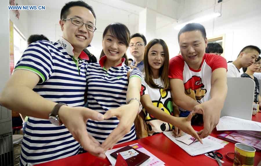 Lovers register for marriage at a marriage registry in Jinan, capital of east China's Shandong Province, May 20, 2014. Many couples chose to register for marriage on May 20 as the sound "520" is homophonic for "I LoveYou" in Chinese. (Xinhua/Zhao Xiaoming)