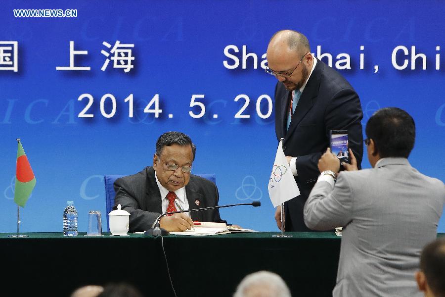 A.H. Mahmood Ali (L), minister of foreign affairs of Bangladesh, signs on a memorandum of understanding about Bangladesh's becoming a member of the Conference on Interaction and Confidence Building Measures in Asia (CICA) in Shanghai, east China, May 20, 2014. (Xinhua/Zhang Yuwei)