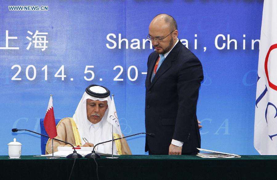 | Qatari Deputy Prime Minister Ahmed bin Abdullah bin Zaid Al-Mahmoud (L) signs on a memorandum of understanding about Qatar becoming a member of the Conference on Interaction and Confidence Building Measures in Asia (CICA) in Shanghai, east China, May 20, 2014. Qatar is going to be the 25th member of CICA. (Xinhua/Lyu Xun) |