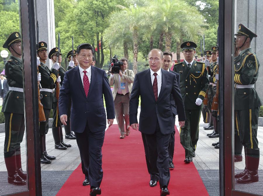 Chinese President Xi Jinping (front L) walks with Russian President Vladimir Putin (front R) in Shanghai, east China, May 20, 2014. (Xinhua/Lan Hongguang)