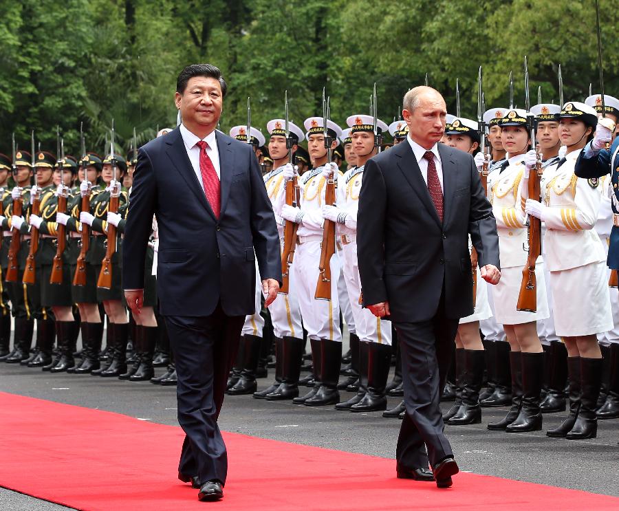 Chinese President Xi Jinping (front L) holds a welcoming ceremony for Russian President Vladimir Putin (front R) before their talks in Shanghai, east China, May 20, 2014. (Xinhua/Pang Xinglei)