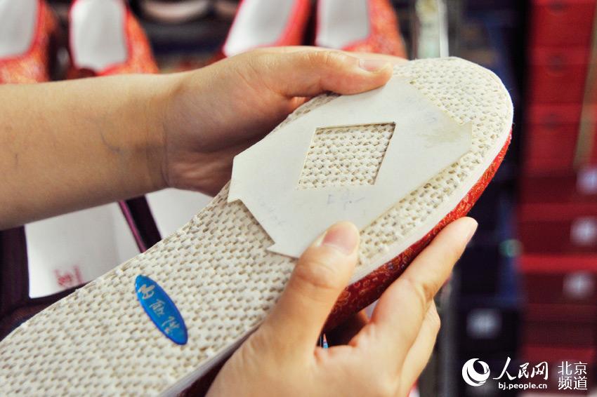 A shoemaker examines the sole with a special tool: inside each square frame, there must 81 neat stitches.(bj.people.cn)