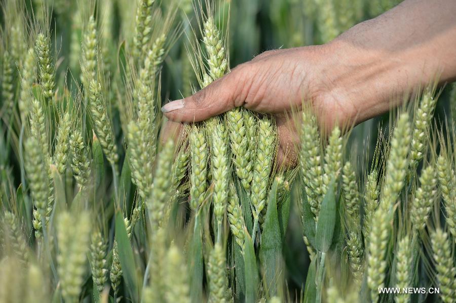 | Farmer Chen Zhanyi examines ripe wheat in Wusi Village of Xingtai City, north China's Hebei Province, May 21, 2014. A total of 35.61 million mu (2.374 million hectares) of wheat fields here are going to enter into the harvest season. (Xinhua/Zhu Xudong) |