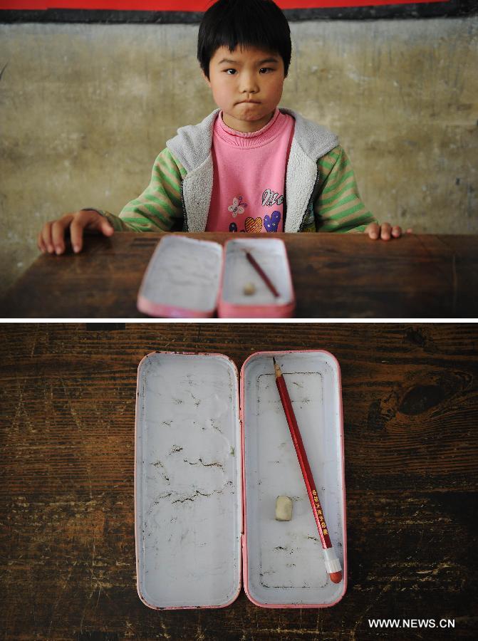 This photo combination shows second-grade student Zhang Xinyi (above) and the inside of her pencil box (below) at Baimiao Elementary School in Sanquan Town of Nanchuan District, southwest China's Chongqing Municipality, May 20, 2014. Most of the 45 students enrolled in Baimiao Elementary School are left-behind children from nearby rural areas whose parents make a living as migrant workers in cities. For years, the students here have been faced with insufficient educational supplies, notably stationery. (Xinhua/Li Jian)