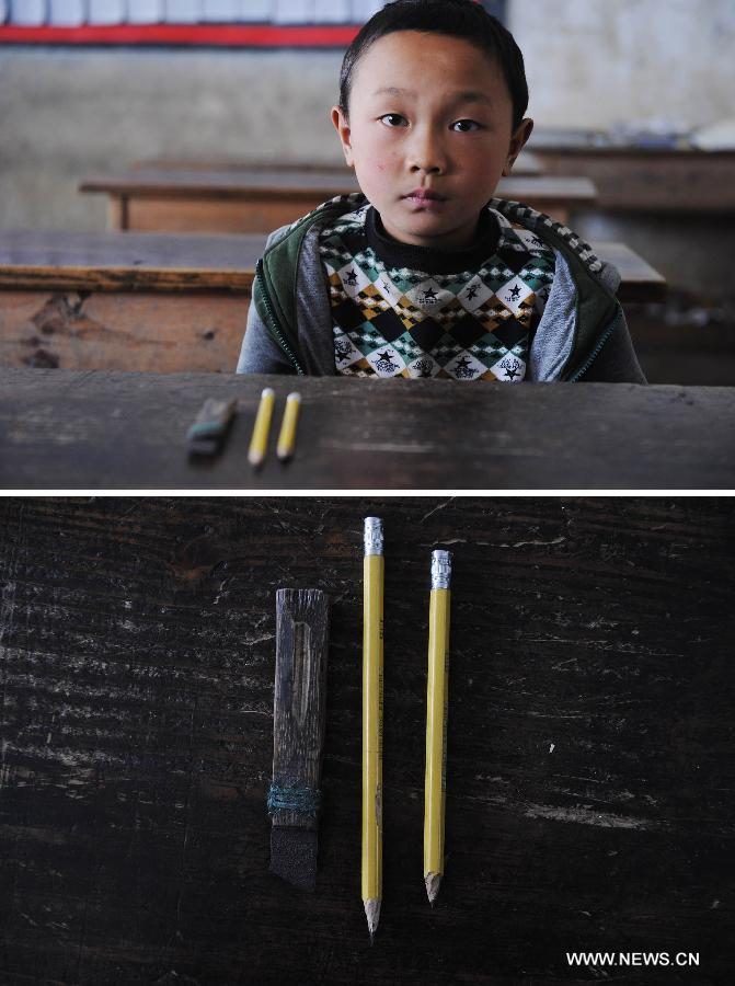 This photo combination shows second-grade student Wei Chao (above) along with his pencils and a knife used as a pencil-sharpener (below) at Baimiao Elementary School in Sanquan Town of Nanchuan District, southwest China's Chongqing Municipality, May 20, 2014. Most of the 45 students enrolled in Baimiao Elementary School are left-behind children from nearby rural areas whose parents make a living as migrant workers in cities. For years, the students here have been faced with insufficient educational supplies, notably stationery. (Xinhua/Li Jian)