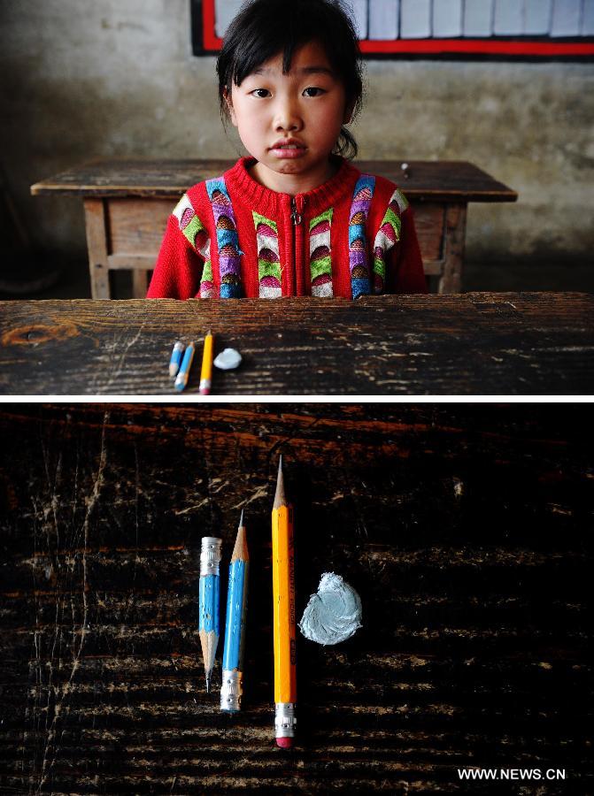 This photo combination shows second-grade student Ren Ai (above) and her set of stationery (below) at Baimiao Elementary School in Sanquan Town of Nanchuan District, southwest China's Chongqing Municipality, May 20, 2014. Most of the 45 students enrolled in Baimiao Elementary School are left-behind children from nearby rural areas whose parents make a living as migrant workers in cities. For years, the students here have been faced with insufficient educational supplies, notably stationery. (Xinhua/Li Jian)