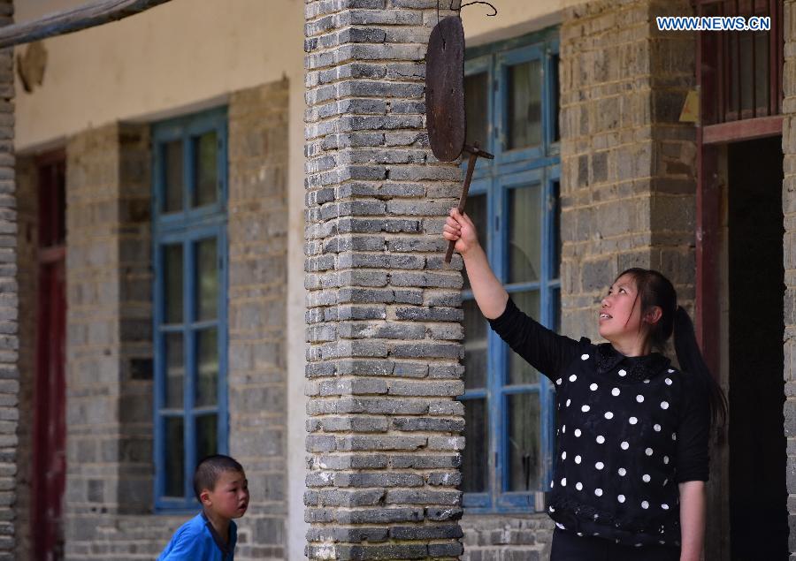 | A teacher strikes an iron school bell at Liyuan Elementary School in Xikeng Village under Wanzai County of Yichun, east China's Jiangxi Province, May 20, 2014. The lack of trained teachers has been a ubiquitous problem that bothers many elementary schools in rural China. Education authorities of Wanzai County have launched a five-year teacher training program in 2014 to address the demand for teachers in the county's rural areas. Each year, the program will receive 30 junior high applicants who are from rural areas. Half of the applicants are required to work in rural schools when they finish the program. (Xinhua/Zhou Mi) |
