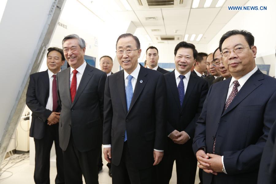 | UN Secretary-General Ban Ki-moon, accompanied by President of Xinhua News Agency Li Congjun, visits Xinhua News Agency, in Beijing, capital of China, May 20, 2014. (Xinhua/Wang Jianhua) |