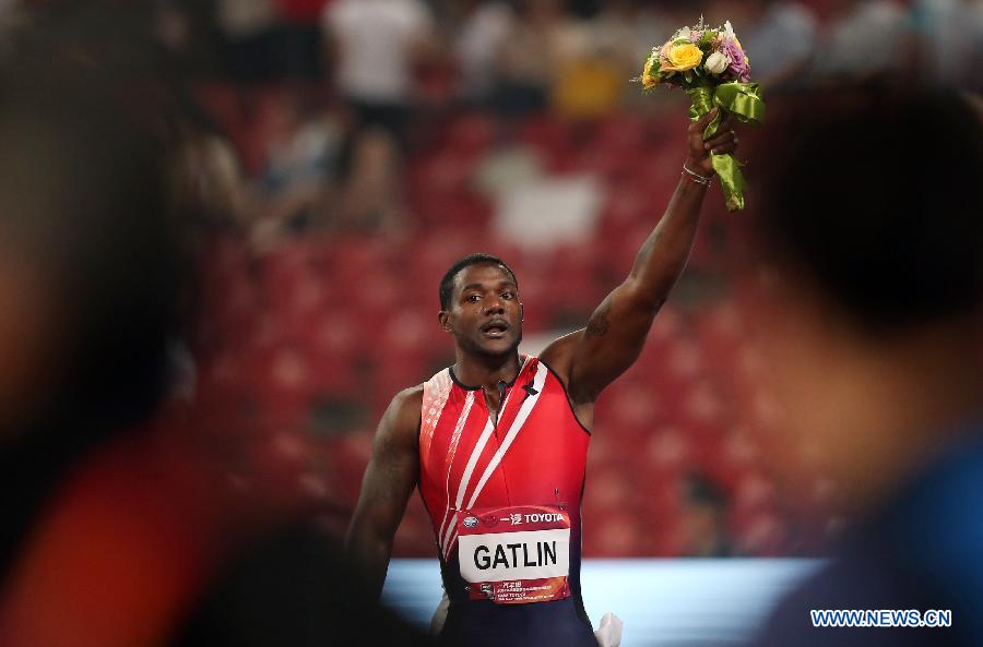Justin Gatlin of the United States celebrates after winning the men's 100 meters at the IAAF World Challenge Beijing, China, May 21, 2014. Justin Gatlin finished the match in 9.87 seconds and claimed the title. (Xinhua/Bai Xuefei)