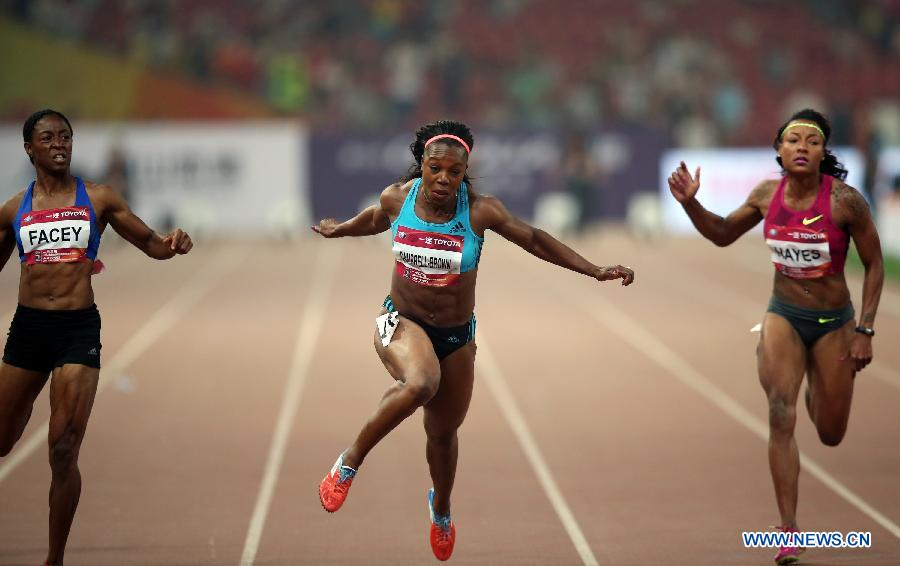Justin Gatlin (2nd L) of the United States competes during the men's 100 meters at the IAAF World Challenge Beijing, China, May 21, 2014. Justin Gatlin finished the match in 9.87 seconds and claimed the title. (Xinhua/Bai Xuefei)