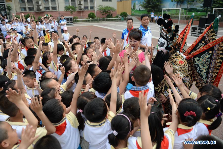 A Peking opera actor interacts with pupils during an event "Peking Opera Comes to Campus" at Haojiaxiang Elementary School in Xi'an, capital of north China's Shaanxi Province, May 22, 2014. (Xinhua/Li Yibo)