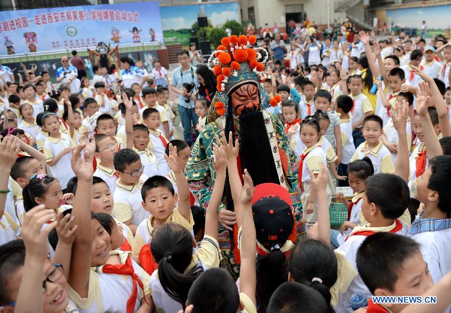 A Peking opera actor interacts with pupils during an event "Peking Opera Comes to Campus" at Haojiaxiang Elementary School in Xi'an, capital of north China's Shaanxi Province, May 22, 2014. (Xinhua/Li Yibo)