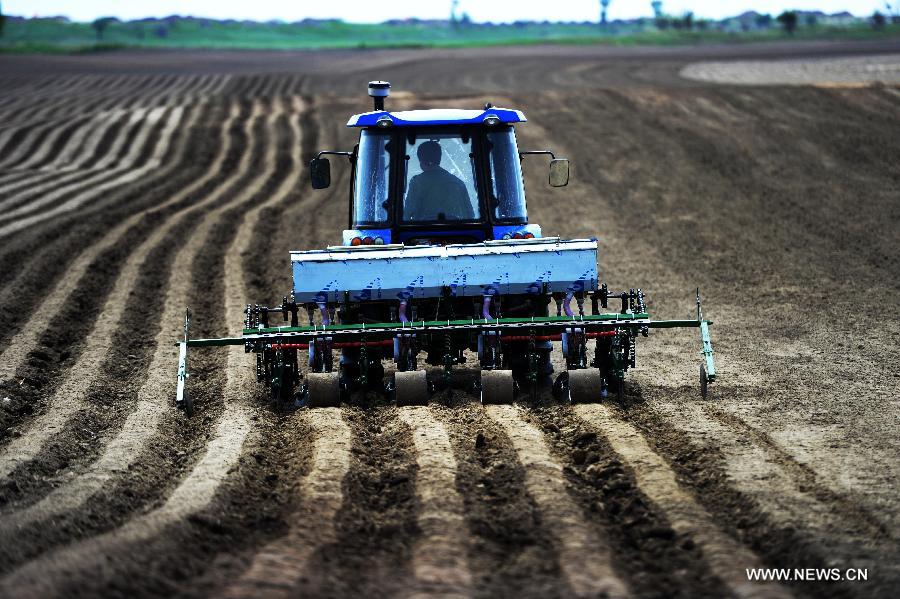 | A villager drives a seeding machine as he sows corn seeds in Xin'an Village of Bacha Hezhe Autonomous County in Tongjiang City, northeast China's Heilongjiang Province, May 21, 2014. Farmers in Luobei, Suibin and Tongjiang counties, which suffered from serious flood in 2013, are busy with spring ploughing. (Xinhua/Wang Kai) |