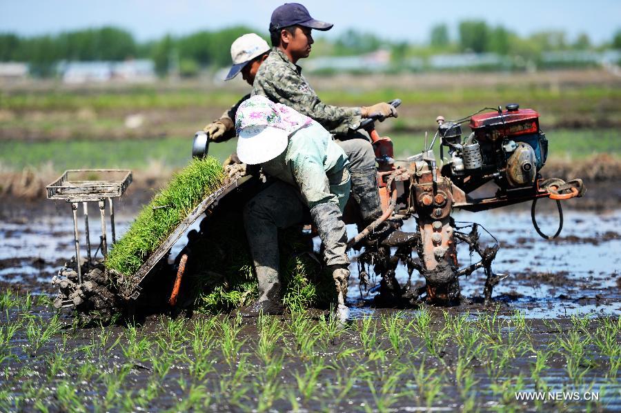 Villagers drives a rice planter as they transplant rice seedlings in Yufeng Village of Zhaoxing Township in Luobei County, northeast China's Heilongjiang Province, May 19, 2014. Farmers in Luobei, Suibin and Tongjiang counties, which suffered from serious flood in 2013, are busy with spring ploughing. (Xinhua/Wang Kai)