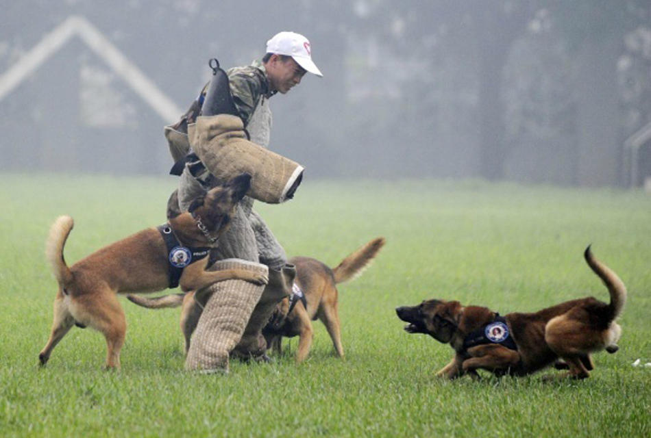 82 police dogs from across the country compete in a canine combat skill competition with their trainer in Foshan, Guangzhou province on May 20, 2014. The three-day-long competition contained seven games for different kinds of police dogs. (Photo/ Guangzhou Daily)