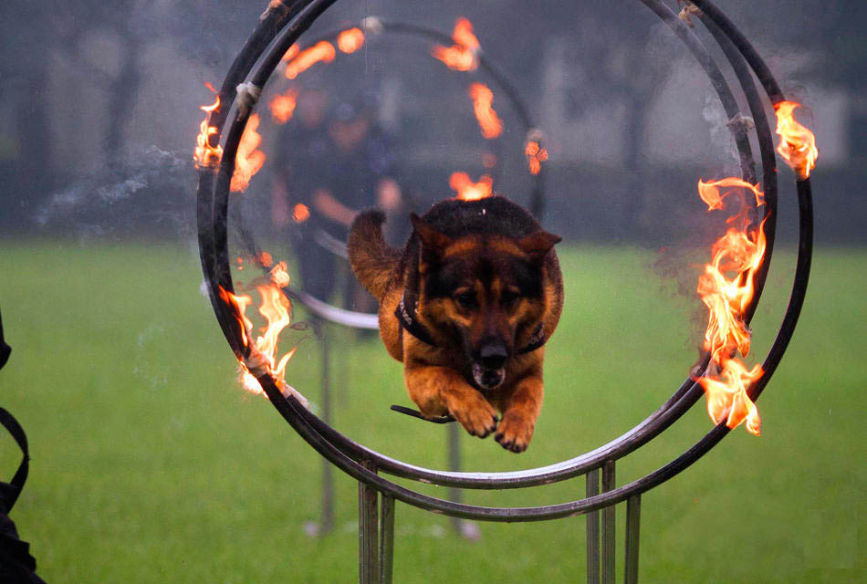 82 police dogs from across the country compete in a canine combat skill competition with their trainer in Foshan, Guangzhou province on May 20, 2014. The three-day-long competition contained seven games for different kinds of police dogs. (Photo/ Guangzhou Daily)