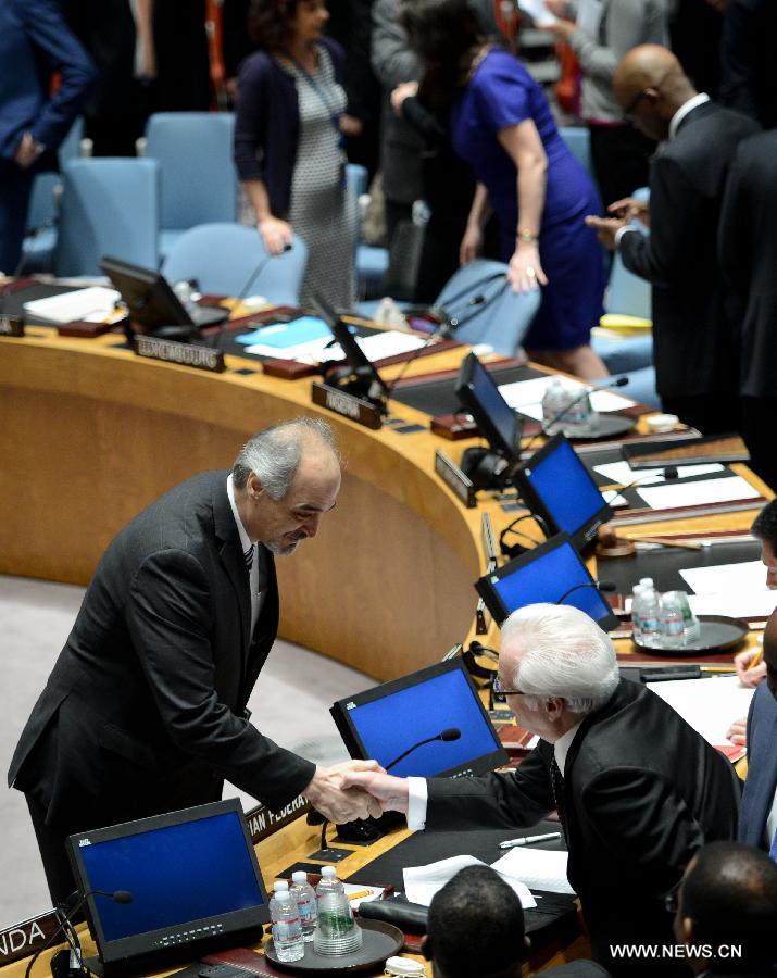 Bashar Ja'afari (front L), Syria's permanent representative to the United Nations, shakes hands with his Russian counterpart Vitaly Churkin before the Security Council votes on a draft resolution on Syria, at the UN headquarters in New York, on May 22, 2014. Russia and China, two permanent members of the UN Security Council, on Thursday used their veto power over a draft resolution intended to refer the Syrian civil war to the International Criminal Court (ICC). (Xinhua/Niu Xiaolei)