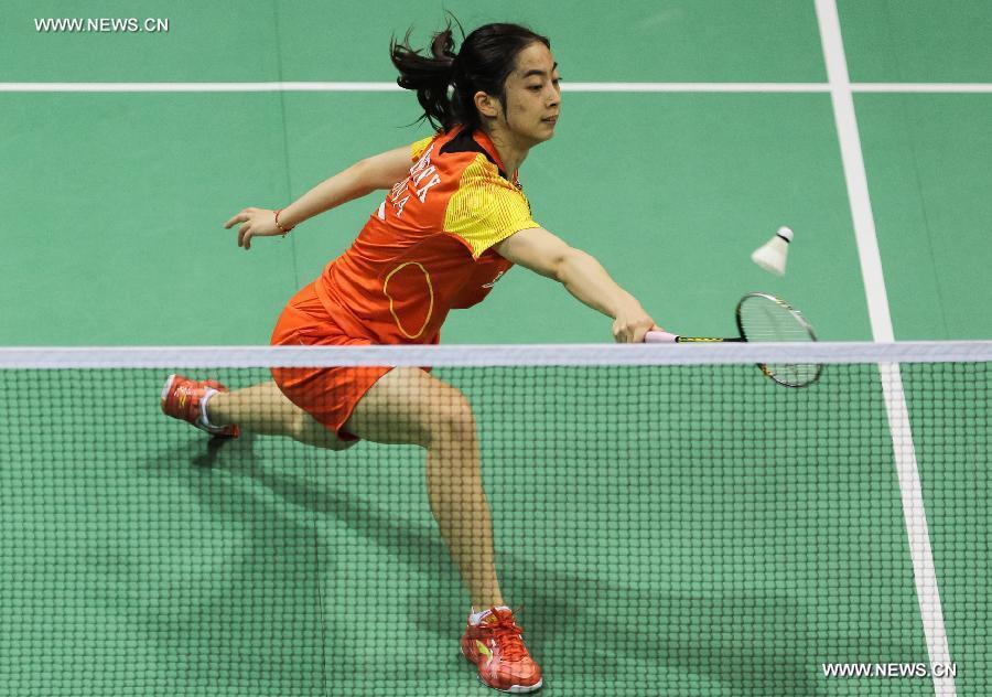 China's Wang Shixian returns a shot during the women's singles match against England's Sarah Walker in the quarter final of Uber Cup badminton championship in New Delhi May 21, 2014. Wang won the match 2-0 and China advanced to the semifinal with 3-0. (Xinhua/Zheng Huansong)
