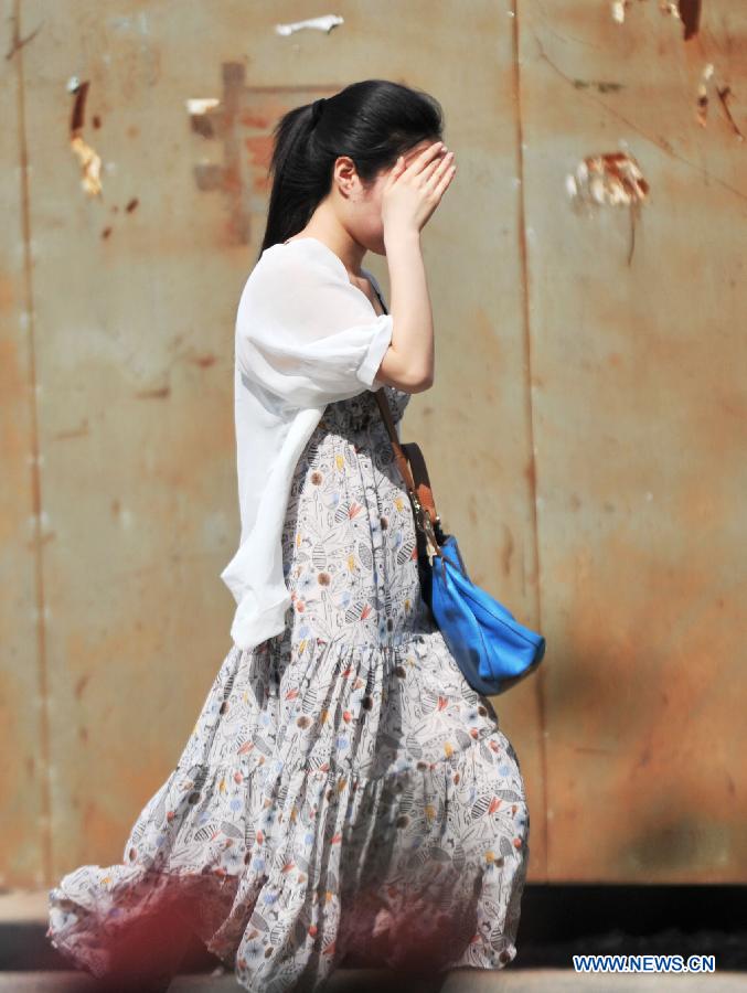 A woman uses her hand to shield herself from the hot sun in Beijing, capital of China, May 22, 2014. The highest temperature reached 35.3 degrees Celsius in Beijing on Thursday. (Xinhua/Li Wen)