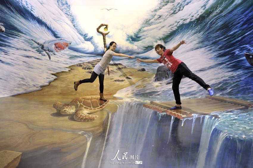 The largest 3D magic city in Asia opened in Guangzhou recently. Visitors can interact with the 3D paintings by posing with them. The photos are interesting because the 3D effect can give a transcending experience to visitors.(vip.people.com.cn/Gao Dianhua)