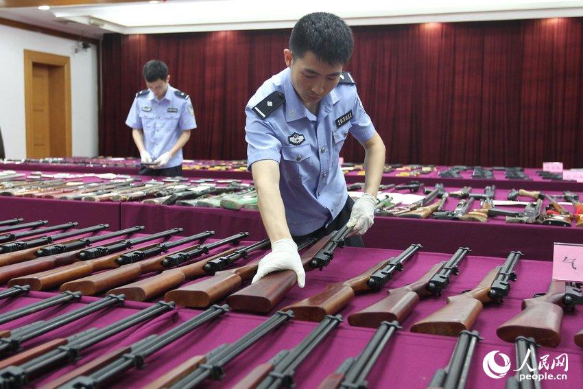 From January to May 20, Guangdong police has solved 338 cases involving firearms, up 7.3 percent year-on-year and arrested 232 online gun-related fugitives, up 52.6 percent, Guangdong Public Security Department announced on Thursday. Over the past six months, a total of 845 guns, 11,093 rounds of ammunition and 77,393 kilograms of explosives, 9,130 detonators and 316,000 replica guns were confiscated. (People's Daily Online Photo)