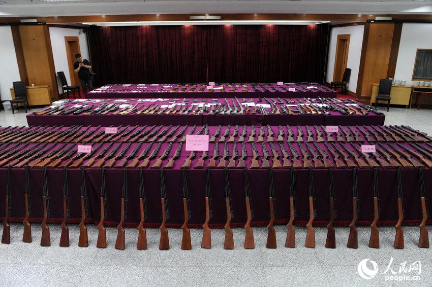 From January to May 20, Guangdong police has solved 338 cases involving firearms, up 7.3 percent year-on-year and arrested 232 online gun-related fugitives, up 52.6 percent, Guangdong Public Security Department announced on Thursday. Over the past six months, a total of 845 guns, 11,093 rounds of ammunition and 77,393 kilograms of explosives, 9,130 detonators and 316,000 replica guns were confiscated. (People's Daily Online Photo)