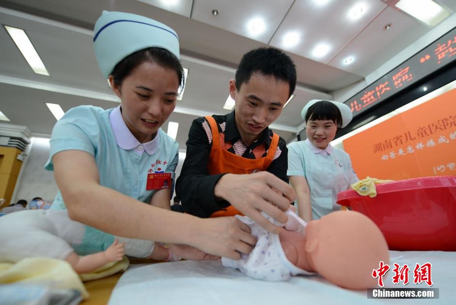 A total of 40 new and expectant fathers attend the super daddy training camp at Hunan Children's Hospital in Changsha, central China's Hunan province, May 23, 1014. They would learn baby nurturing skills in a short time under the guidance of paediatricians, including how to feed, bathe and swaddle babies and change loaded diapers.(Chinanews/Yang Huafeng)