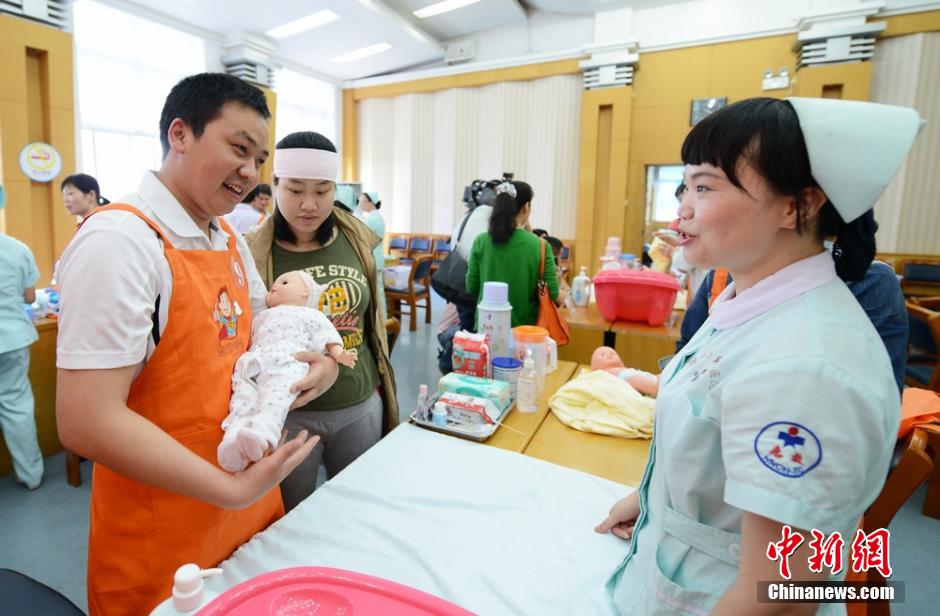 A total of 40 new and expectant fathers attend the super daddy training camp at Hunan Children's Hospital in Changsha, central China's Hunan province, May 23, 1014. They would learn baby nurturing skills in a short time under the guidance of paediatricians, including how to feed, bathe and swaddle babies and change loaded diapers.(Chinanews/Yang Huafeng)