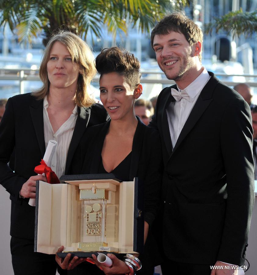 French directors Marie Amachoukeli, Claire Burger and Samuel Theis (L to R) present the Camera d'Or prize of the 67th Cannes Film Festival for the film Party Girl, in Cannes, France, May 24, 2014.(Xinhua/Chen Xiaowei)